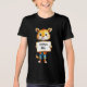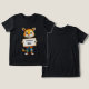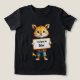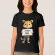 Make your child's T-shirt unique with our adorable cat character design! Featuring an anthropomorphic cat with orange fur, dark spots, and a friendly smile, this T-shirt is perfect for personalization. The cat is dressed in a casual red jacket, blue shorts with patches, and red shoes, holding a blank sign that can be customized with your child's name or message. The vibrant design is sure to bring joy and smiles to any kid's wardrobe.
