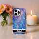 This enchanting phone cover features a heavily textured, abstract design with bold impasto brushstrokes in a serene palette of blues, purples, and pinks, beautifully accented by delicate white lines connecting dots that resemble abstract constellations. This artistic, cosmic aesthetic adds a unique flair to your device. A sleek black bar at the bottom offers personalization with a name like "Elizabeth"; if you don't want a name, you can remove it and any other elements you don't like from within the design tool, crafting a truly bespoke smartphone accessory.