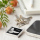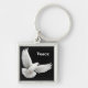 Original fine art design of a flying white dove by designer Carolyn McFann of Two Purring Cats Studio on a customizable keychain for bird fans.