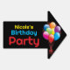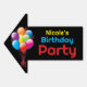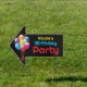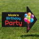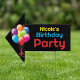 Help friends find the celebration easily using this double-sided outdoor guide. The layout displays a bold onyx backdrop which makes the vivid primary colors pop for excellent street visibility. Featuring a realistic cluster of floating inflatables and distinct lettering, this weatherproof garden accessory ensures no one gets lost finding your home. Modify the template area with the honoree's details to create a unique welcoming atmosphere right at the driveway entrance.