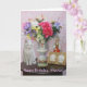 Customizable card with Missy by flowers in a pretty vase, a figurine, a gold picture frame, and a music box. You can customize the text. You can change the background color inside.