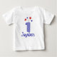 Here is a cute shirt for your little boy to wear on his first birthday. It has the number one that has a blue and white check pattern. There are red and blue stars shooting out from the number one. Underneath is the name of the birthday child that you can type in so that the shirt is customized just for the birthday boy. If you click on the orange customize rectangle you can also change the font, color and size. If you want a different number or design please contact me as I can change it for you.