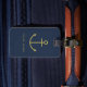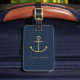 A customizable blue luggage tag with a gold anchor.