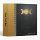 Elegant black and gold binder that brings luxury to your document storage, featuring a gold spine, black covers, a stunning triple moon graphic with center pentacle and golden rays descending from the main graphic, topped with lustrous tiny pearl design trim. There are customizable text areas on the spine and front cover where you can add your name, a phrase, magickal words or your name. Great as a Book of Shadows, a spell book, or anything else you desire. Make a bold statement with this fashionable binder.