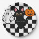 A paper plate with a ghost, black cat, and orange pumpkin. Text can be edited or removed. Perfect for a Halloween party. Matching cups and napkins available.