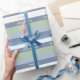 Horizontal pastel light blue, light green and dusty blue striped pattern and customizable text: Happy Easter. Click edit to change the text and name to your liking,
