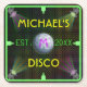 Create your own custom 1970's disco home bar paper coasters using this template. The coasters have a green neon border with four spotlights shining onto a silvery disco mirror ball / glitter ball. The black background has a faint rainbow of colorful squares. These funky coasters can be personalized with your first or last name, initial / monogram and the year your bar or 70's or 80's-themed man cave was established (or the year your party is being held). Just fill in the DIY template or "Customize It" if you need to resize, rearrange or change text colors & fonts. These are perfect for a retro disco-themed party or all year long.