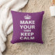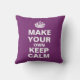 A throw pillow template in the style of Keep Calm and Carry On. The placeholder text states Make Your Own Keep Calm. Just edit the text in the boxes to the right of the picture and you can change the message to say anything you want. You're no longer limited to what you can find in the marketplace - your imagination is the only limit! Shown in purple the color can be customized by pressing 'Customize Further' > Edit > Background.