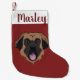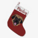 Perfect! Exactly what I ordered! I uploaded a picture of my blue chow, and the screen print was incredible. the back side of the stocking was the red and black checkered print. my puppy's name was also printed on the cuff of the stocking. PERFECT! Highly recommend this product! My puppy's name was screen printed onto the cuff of the stocking, the font was perfect!