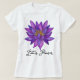 The t-shirt features a bold purple lotus flower with yellow stamens at the centre. Beneath the flower, there is text that currently reads “Lotus Flower” in a decorative cursive font. This text is customizable, meaning it can be changed to any wording, phrase, or name of your choice to personalize the design.