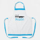 Cool Customizable Personalized Chef Name Mens Womens Apron. Displayed is white chef apron with cool knife design and customizable chef name in black and blue letter print. Apron strap colors are customizable and border colors can be changed to other colors like black, red or any other color or completely removed to suite your needs to your personal taste and needs.