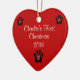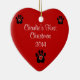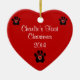 Commemorate your fur baby's first Christmas with this adorable tree decoration featuring black paw prints with a red heart in the center on a red background. Personalize with your pet's name.