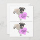 The front of this post card has a digital photo of a Pug holding a pink heart. Text in the heart is customizable! Cut along the dotted cutting line and you will have 2 Valentine cards for the price of 1. The reverse side of this card is blank for your convenience. Purchase these in bulk - they make great Valentine cards for school!