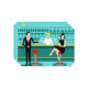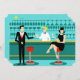 Every hour is happy hour with this Customizable Retro Cocktail Lounge Invitation. The mid century modern design features a vibrant, 1960's style, minimalist, cartoon drawing of a classy, cocktail bar. Against the backdrop of an aqua wall, we can see rows of drink glasses. At least we can see the teal silhouettes of drink glasses. Judging from the shapes of the stemware, this bar is well equipped to wet your whistle, whatever your drink preference. A most competent and personable bartender is manning the teal bar with yellow accents. The young barkeep is wearing a pristine, white shirt with black bow tie. His fresh-faced good looks, blond hair and black hipster glasses give us every reason to believe that he either spends his days as a struggling actor or a superhero. In one hand, the handsome mixologist is handing a martini to a customer on the opposite side of the bar. The waiting customer is a broad-shouldered gentleman in a black suit and red tie. He's the sort of fellow who is described as tall, dark, and handsome even when it's still hours until closing time. There seems to be a red and chrome bar stool with Mr. Debonair's name on it. Yet, not to be presumptuous, he asks the question, "Pardon me. Is this seat taken?" He is asking the raven haired gal on the neighboring bar stool. She's a real "girl next door" type, if you happen to live next door to a flawless beauty with a figure that won't quit. She is wearing a black dress and holding a martini in one hand. She's hoping that she and the approaching gentleman have more in common that their drink preference and choice of wardrobe color. It looks like this evening just got interesting. Cheers to you! Personalize for your special occasion!