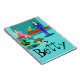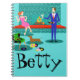 This Customizable Retro Couple with Dog Spiral Notebook looks like a scene out of a romantic comedy. The 1960s's style, minimalist art design features an attractive couple enjoying a romantic evening at home. The sophisticated room prominently features an aqua and teal brick fireplace with a bright red ledge. A beautiful, redhead woman wearing a bright, pink dress is perched on the ledge. She is enjoying a martini with a floating olive, a roaring fire, good music, and the company a tall, dark and handsome man. The man is wearing a blue suit and red tie. His martini glass is raised to toast his charming companion. In his other hand, he is holding a vinyl record album. At his feet, we see a most adorable dachshund wearing a red collar. The playful wiener dog is walking in the direction of a green record player with orange, spindle legs. On the floor, there is a colorful group of fun, eclectic, vinyl records. Cheers! Here's to the perfect evening at home. Personalize this design with the name of the recipient.