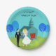 These Customizable Retro Wedding Couple Paper Plates will have you hearing wedding bells. The 1960's style, minimalist art design features a bride and groom on their wedding day. The happy couple looks good enough to be standing atop a wedding cake. But they aren't. They're standing on lush, green grass. The debonaire Mr. is wearing a classic, black tuxedo with black bow tie. Down, ladies! He's taken! He is holding the hand of his beautiful Mrs., who looks positively radiant in her tea length, white gown with form fitting waist and flared skirt. She truly looks like a princess with her tiara and gauzy, white wedding veil resting on her pretty blonde head. Beside them, a path in the grass leads to the world's most charming chapel. The quaint, teal and turquoise church is the perfect setting for saying, "I do!" Yes, here is the church. Here is the steeple. We can only assume that, behind those bright red, double doors is a roomful of people just waiting to share in this couple's happiness. The picturesque setting also includes four, stylistic, cartoon trees in shades of blue. It's a beautiful day for a wedding, as we can see from the flawless aqua sky. The only thing missing from this mid century modern design is the rice, and we can assume that will be forthcoming. Personalize with names and date.