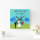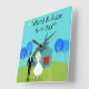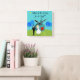 This Customizable Retro Wedding Couple Wall Clock will have you hearing wedding bells. The 1960's style, minimalist art design features a bride and groom on their wedding day. The happy couple looks good enough to be standing atop a wedding cake. But they aren't. They're standing on lush, green grass. The debonaire Mr. is wearing a classic, black tuxedo with black bow tie. Down, ladies! He's taken! He is holding the hand of his beautiful Mrs., who looks positively radiant in her tea length, white gown with form fitting waist and flared skirt. She truly looks like a princess with her tiara and gauzy, white wedding veil resting on her pretty blond head. Beside them, a path in the grass leads to the world's most charming chapel. The quaint, teal and turquoise church is the perfect setting for saying, "I do!" Yes, here is the church. Here is the steeple. We can only assume that, behind those bright red, double doors is a roomful of people just waiting to share in this couple's happiness. The picturesque setting also includes four, stylistic, cartoon trees in shades of blue. It's a beautiful day for a wedding, as we can see from the flawless aqua sky. The only thing missing from this mid century modern design is the rice, and we can assume that will be forthcoming. Personalize with names and date. This design is ideal for congratulating your favorite newlyweds or anniversary couple.