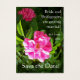 A customizable 'Save the Date!' card with two bright pink roses, from a photograph by Judy Adamson.