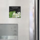 A pretty 'Save the Date' fridge magnet for you to personalize, with a sprig of fragrant Mock Orange Blossom, on a black background, from a photograph by Judy Adamson