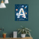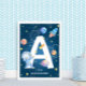 Embark on a cosmic journey with this customizable 'A' letter poster, featuring an astronaut, planets, stars, and a rocket ship. Perfect for space-themed nurseries and children's rooms, this vibrant design can be personalized with a name, making it a unique and special piece of decor. Inspire a love for the universe with this charming and educational artwork.