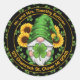 A cheerful circular design featuring a whimsical gnome holding a four‑leaf clover, framed by bright sunflowers and tiny shamrocks. Perfect for creating customizable envelope seals or return address labels with a fresh, festive St. Patrick’s Day touch.