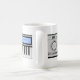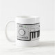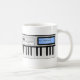 A customizable mug with a synthesizer keyboard design. The synthesizer has a piano keyboard, control buttons and knobs. A blue digital display has a customizable text area.