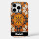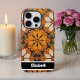 This striking phone cover features a beautifully textured, impasto oil painting style pattern, showcasing an intricate mandala-like floral design in vibrant oranges, yellows, and creams against a deep grey background. The prominent, tactile brushstrokes give it a sophisticated, artistic flair. A sleek black bar at the bottom offers personalization with a name like "Elizabeth"; if you don't want a name, you can remove it and any other elements you don't like from within the design tool, crafting a truly bespoke smartphone accessory.
