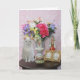 Customizable card with Missy by flowers in a pretty vase, a figurine, a gold picture frame, and a music box. You can customize the text.
