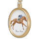 Original fine art design of a racing Thoroughbred horse and jockey by designer Carolyn McFann of Two Purring Cats Studio on a customizable pendant for equestrian racing sport fans.