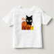 This Halloween fashion shirt is so cute for a toddler girl. This shirts design features orange pumpkins, autumn leaves, and black cat. Dress your toddler in this tee throughout the Halloween season. . Customize tee with your own name.