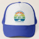 These cool personalized tropical beach sunset hats feature 3 palm trees silhouetted against an orange and blue sky accented with yellow and green at the coast. Customize for a great family trip keepsake trucker hat for your coastal getaway this spring break or summer or ocean cruise vacation.