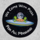 It’s not about the sauce, it’s about the saucer. These intergalactic space travelers come to our planet with a gift of peace, in this case pizza, for all mankind. This UFO has two little green men as extraterrestrial astronauts and a delicious pizza pie against a starry sky background. This isn’t science, it’s science fiction! What’s more, the interstellar greeting, “We come with pizza for all mankind”, is easily personalized with a custom caption or motto, perhaps to support your own fun party celebration or pizza delivery business.