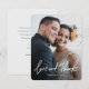 This simply chic custom wedding thank you flat card template features a full photo format and 'love and thanks' in a unique and lively handwriting script in white that we created by hand and adapted for this card. This part of the design can't be altered. When you edit the text below that to show your own names, you might choose to include just your first names as we have in the example, but you might choose to show your first names and last name, or 'Mr. and Mrs.....', etc. The default shape is rounded corners, but this design also looks great with standard sharp corners, so try both looks in editing mode to see which grabs you! On the back we've chosen a background hue that isn't quite white, it's a very light gray that's mostly white called White Smoke. You can change this by picking another color in the editing tools. And we've picked a shade of gray as the default color for the text on the back that you might choose to change to a different hue. We've put some sample text on the back for you to replace with your own message as you see fit, but please don't feel restricted by this. If you prefer to delete our sample text entirely and keep the back totally blank so that you can write a handwritten note on each card instead, you can do that. Or you might want to replace our text with your own message of gratitude and your own closing and then hand sign your names when you receive the cards. You can also change the font. The default paper type, matte, has a soft warmth to it and resists smudging, so it's a great choice for writing your own message. You can edit this and choose semi-gloss or another paper type instead. Just please be sure in any event to delete our sample/placeholder text on both sides of the card, and please remember to replace the placeholder photo on the front with your own. Use the intuitive design tools, your favorite photo and your inspiration and make this simple modern wedding thank you card uniquely yours. And please browse our wedding thank you collection for more elegant modern wedding thank you card designs!