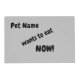 When your pet is eager to eat, you don’t want to forget to feed him or her. This laminated placemat for a dog food bowl or cat feeding bowl will remind you that your pet wants to eat Now! Customizable, so you can put the name of your pet on it.