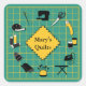 Here’s my special design for fellow quilters with my favorite tools and supplies for quilting, patchwork, needlework and embroidery: sewing needles, spools of thread, pin cushion with stick pins, bobbins, thimble, tape measure, scissors, bolt of cloth, rotary cutter, sewing machine and label on a green and gold self healing cutting mat. A thoughtful gift for yourself or that special creative person in your life.