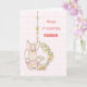 Soft pink background has a subtle pattern. A darling bunny is wearing a pink striped shirt, swinging on a wreath swing. Perfect card to send to any little girl on her first Easter! Personalize with her name!