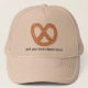 Add a slogan or name to create a personalized gift with a pretzel theme. Image shows a German style pretzel knot of bread (or could be an American crunchy pretzel snack) studded with salt crystals.
