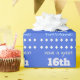This simple and customized birthday wrapping paper design features a message like "Have a great 16th birthday, FirstName!", where the name and birthday number can be customized. It also features decorative diamond shapes. The background is colored royal blue. Wrapping paper like this might be used when wrapping gifts being given to somebody in celebration of their birthday. [~Z0000243]