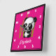 Cute and adorable illustration of a black and white panda bear sitting amongst the green bamboo stalks in a little grove, looking happy, friendly and lovable. Hot pink background.