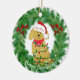 Cute Personalized Cartoon Golden doodle Puppy wearing customized Santa hat with your dog's name, wrapped in christmas lights. Festive christmas wreath border goldendoodle ornament.
