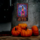 Dress up your lawn or garden this Halloween with this colorful fun garden flag. On the front our adorable cat lady sassy red headed witch holds her black cat on a mysterious Halloween night, three mischievous crows caw in the dead trees, while two ghosts and lots of bats fly through the spooky sky! On the back a flock of black bats against a purple background continue the Halloween theme.