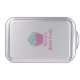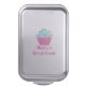 Personalized cake pans featuring a colorful cupcake graphic and an area to add a name or business name on the lid.