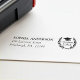 Add a touch of class to your correspondence with this custom self inking laurel wreath return address stamp. Perfect for graduates, this personalized stamp features a sleek laurel wreath design, making it ideal for graduation party favors, moving announcements, and thank you cards. This address stamp is easy to use and leaves a clean, professional imprint every time. Make a lasting impression with this elegant, functional stamp and keep your correspondence looking sharp.