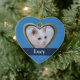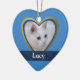 Add a photo of your cat, dog or other furry or feathered friend to the blue and gold frame on this blue heart. Type in your pet's name to appear on the dark blue ribbon below and you have a beautiful personalized ornament to pay tribute to a much loved animal friend. The 'Always in my Heart' message on the back of this ornament is also fully customizable.