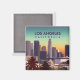 Colorful vector illustration featuring a warm sunset skyline populated with high-rises and palm trees from downtown Los Angeles, California.