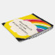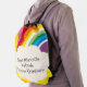 Bright and cheery rainbow drawstring backpack bag features a gorgeous rainbow, yellow background, big white cloud, and an area you can customize with a name, grade, school, or even a quote!