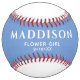 Give your flower girl a unique wedding keepsake she'll enjoy. This blue and white baseball has his role "Flower Girl" and her name in white modern on a blue background. "Thank you" on the back of the ball in the green text on a white background. Perfect for a bridesmaid or the maid of honor gift too.