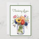 A watercolor illustration of pretty yellow, pink, red, and blue flowers in a jar. This botanical illustration art is perfect for a simple Thinking of You greeting, but you can change the text to your preferred greeting. AI assisted graphic purchased with commercial use. Artwork: DreamCafeArt