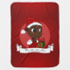 A blanket with an illustration of a cute smiling African American baby holding a Christmas present and wearing a Santa Claus hat; in a red circle on a red background, a Christmas holidays design with an editable text template for your name or message