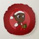 A round pillow with an illustration of a cute smiling African American baby holding a Christmas present and wearing a Santa Claus hat; in a red circle on a red background, a Christmas holidays design